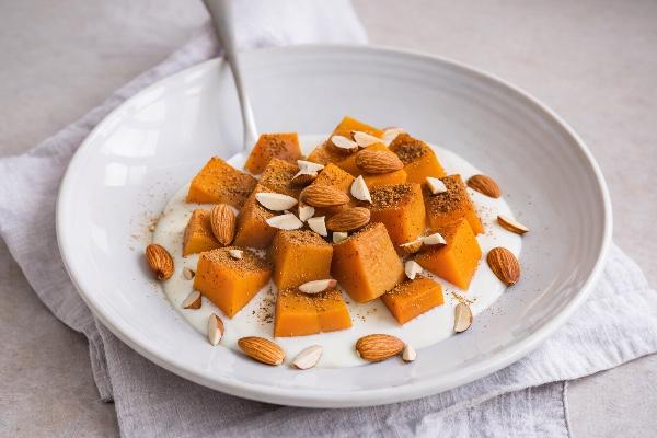 Очищенную от семени тыкву порезать крупно, уложить в керамическую форму приправить корицей, мускатным орехом и запекать под крышкой при температуре 200 С 20 мин. Выложить на блюдо баттернат и орехи. Йогурт будет прекрасным дополнением к перекусу.