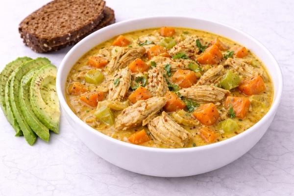 В сотейнике на оливковом масле потушите лук- шалот, добавьте мелко нарезанный чеснок. Через 3 мин. добавьте специи: куркуму, зиру (кумин), кориандр, морковь, батат (сладкий картофель) и мелко нарезанный сельдерей, готовить под крышкой 15 мин. Пока овощи готовятся, отварите мясо индейки (в течение 10-15 мин), мясо разберите по волокнам на небольшие куски и добавьте к овощам, туда же влейте кокосовое молоко. Проварите в течение нескольких минут, чтобы смешались вкусы ингредиентов.